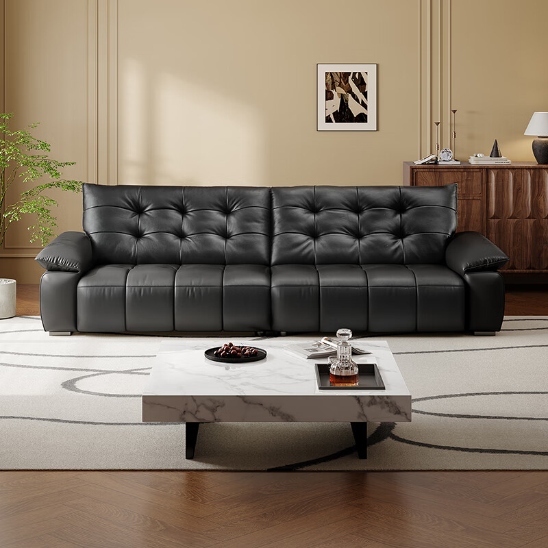 全友家居 复古轻奢风高端真皮沙发客厅家用大黑牛皮艺一字直排式沙发