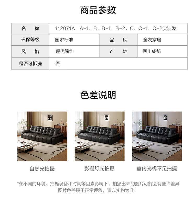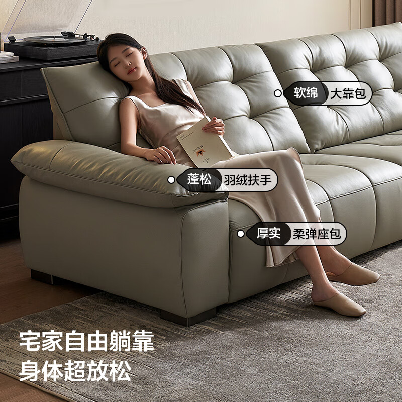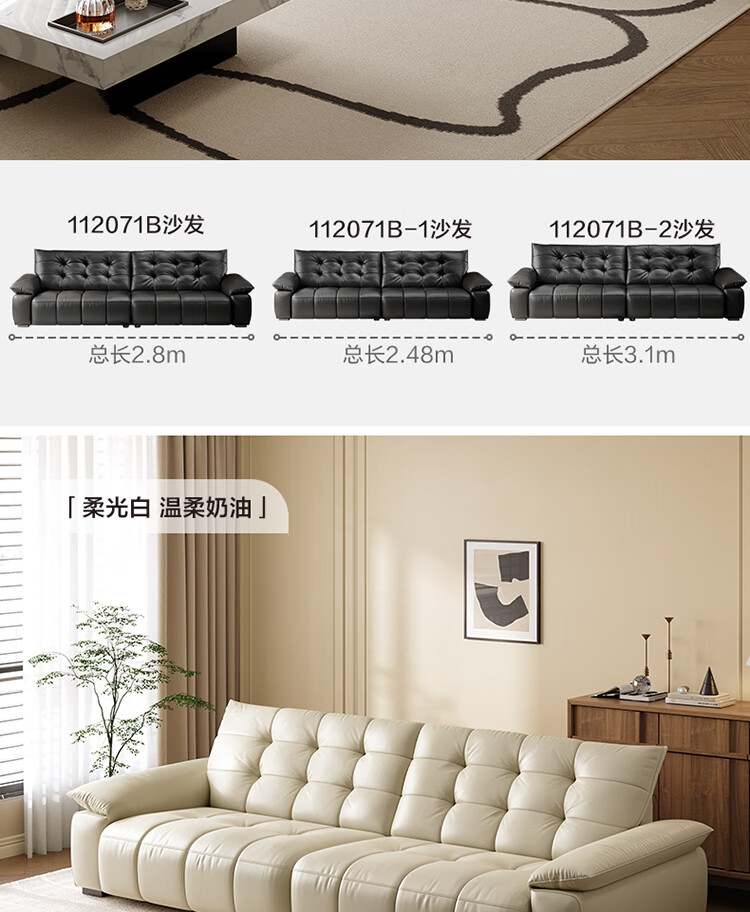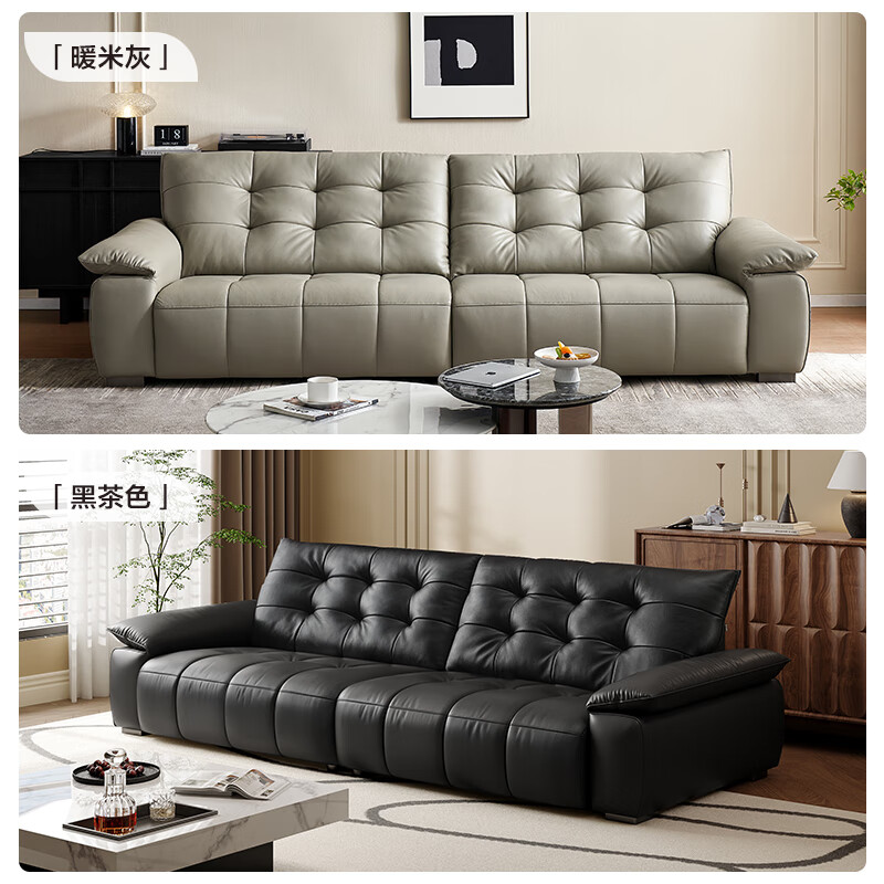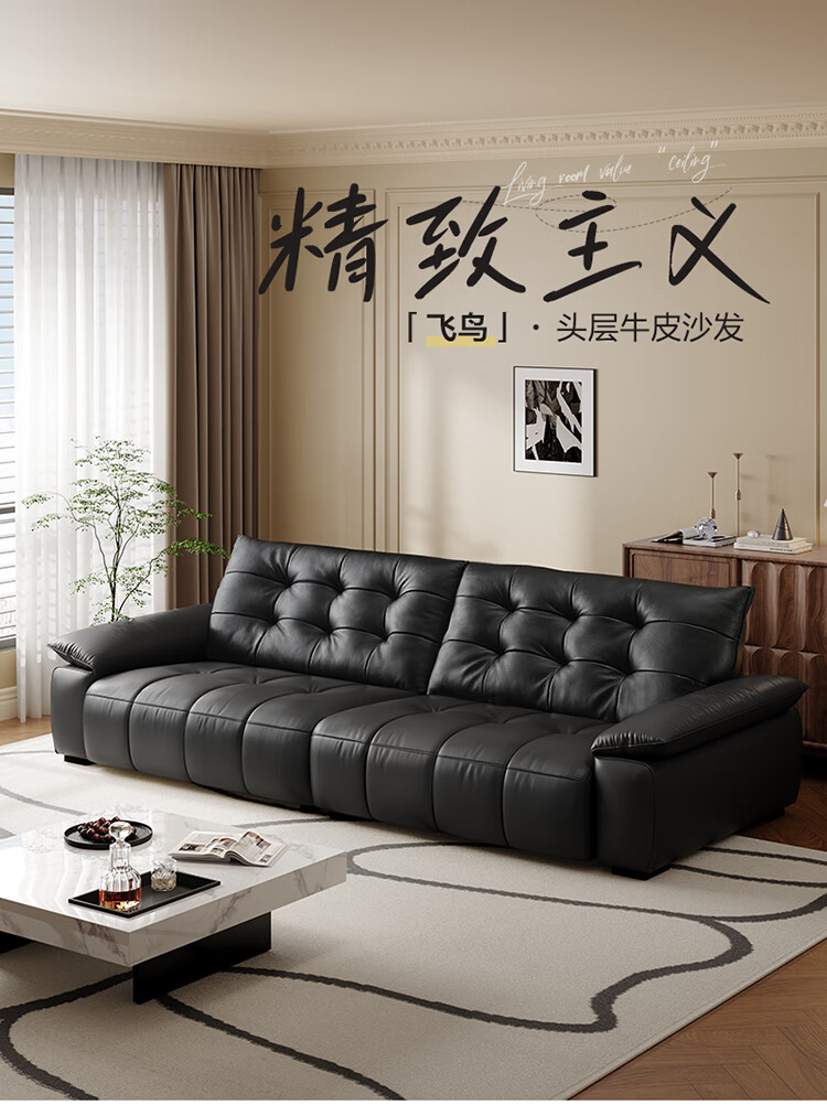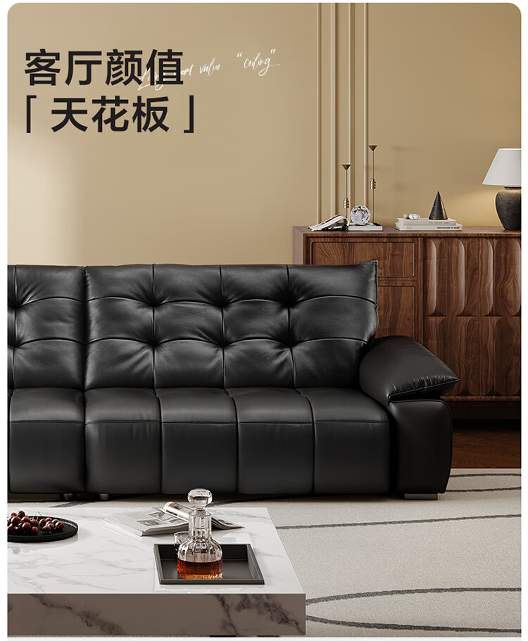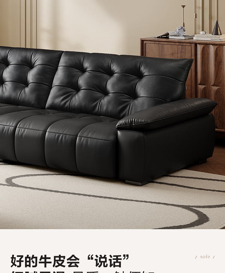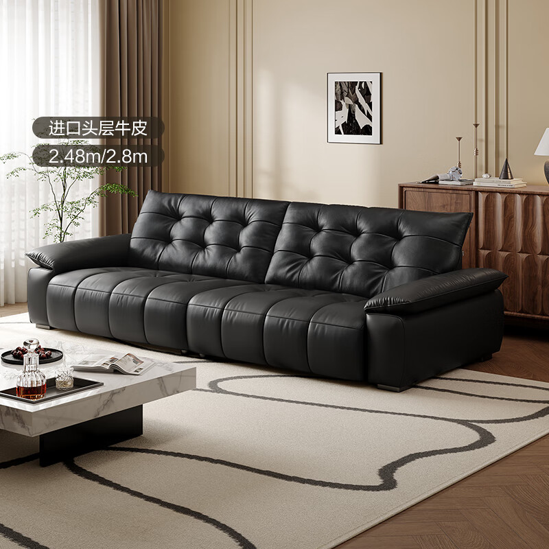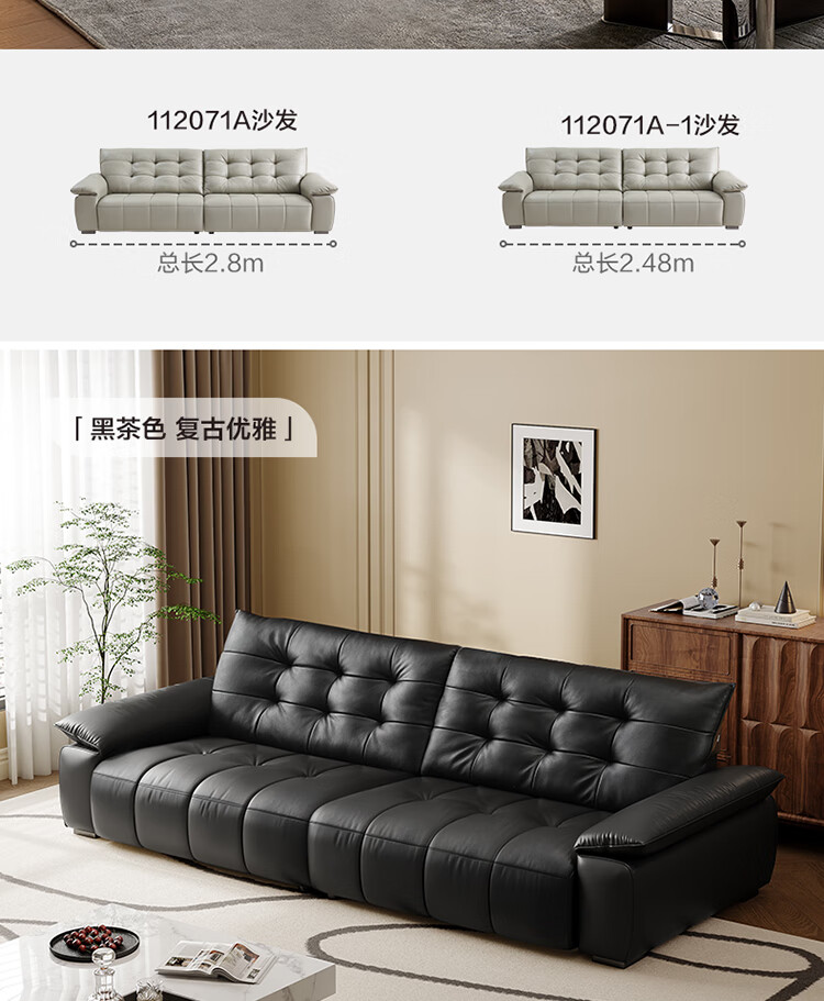 全友家居 复古轻奢风高端真皮沙发客厅家用大黑牛皮艺一字直排式沙发